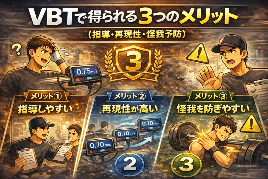 この記事では、 VBTで得られる3つのメリット(指導・再現性・怪我予防) をテーマに、 なぜそれが現場で価値になるのか、 どんな場面で違いが出やすいのかを、 分かりやすく整理していきます。