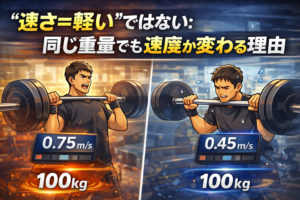 これはVBT導入前からある誤解でもあります。 実際には、 同じ重量でもその日の疲労、 コンディション、 集中度によって、 動きの質は大きく変わります。
