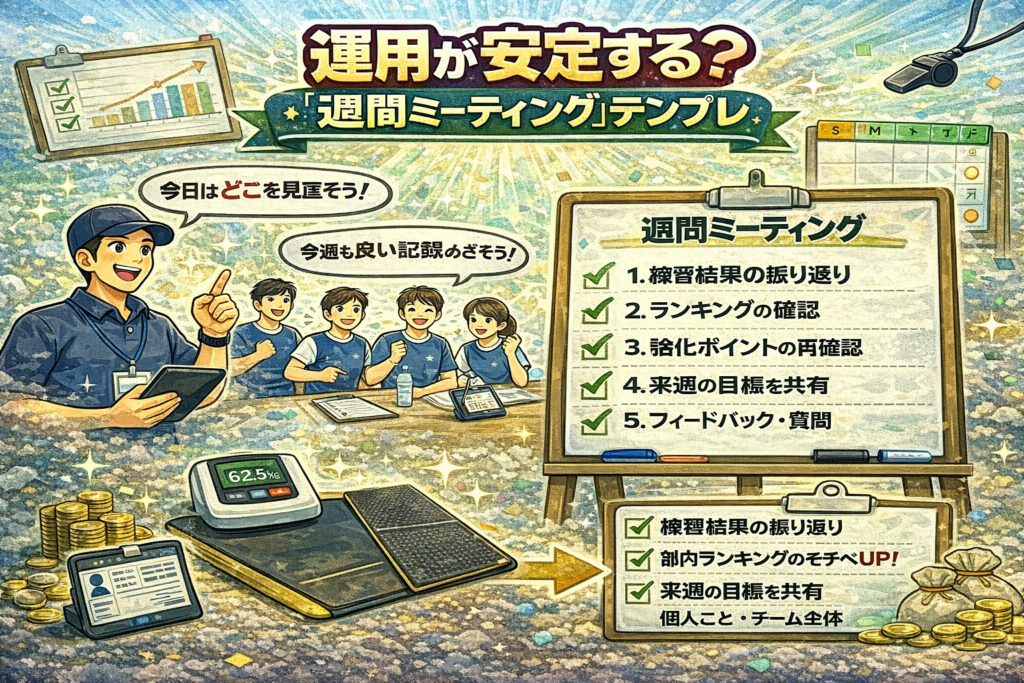 この記事では、 VBT運用が安定しやすくなる「週間ミーティング」テンプレ を、 現場でそのまま使いやすい形で整理します。 何を確認し、 何を決め、 どう次週につなげればよいかを、 シンプルに実務目線でまとめます。